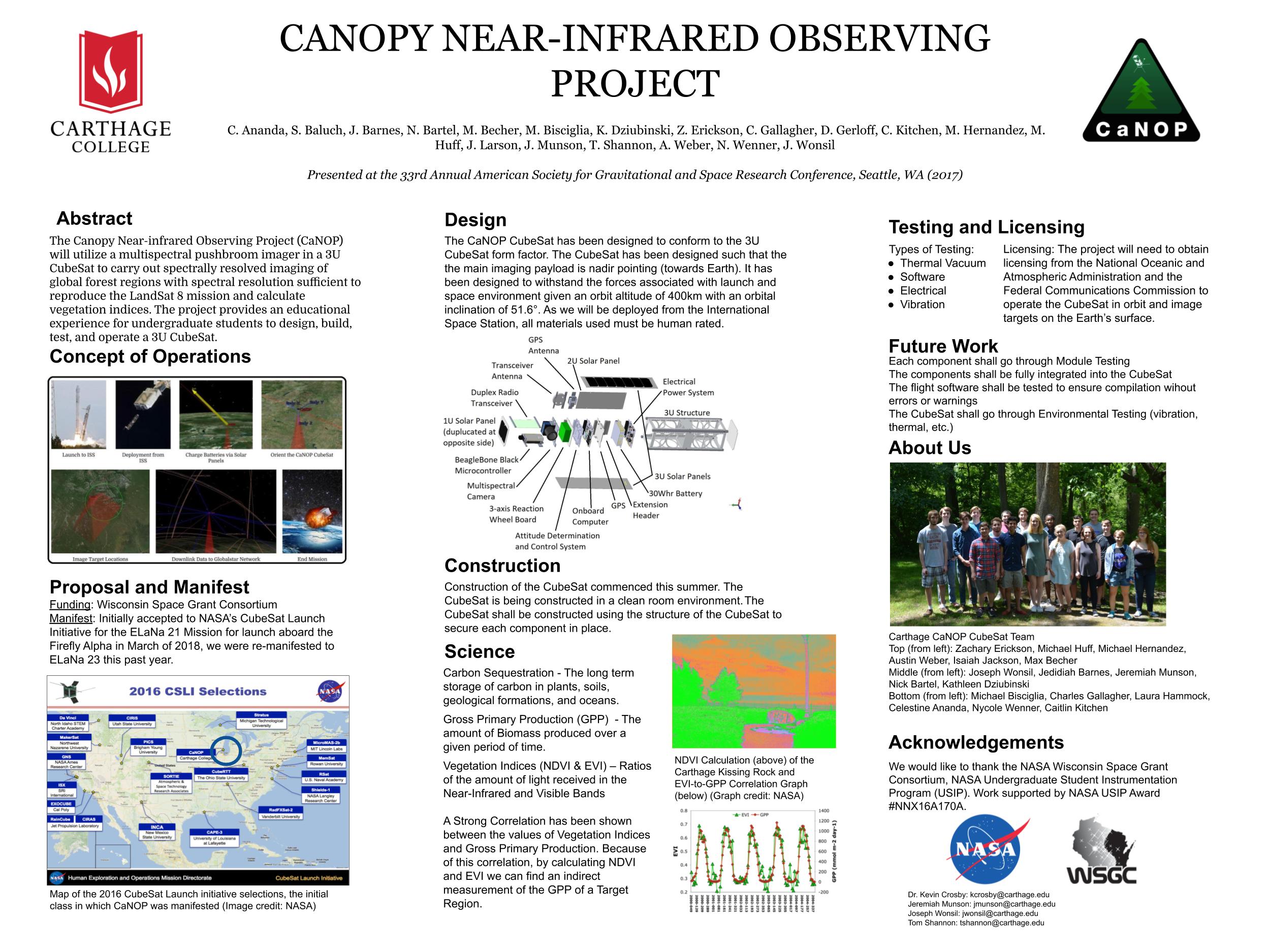 The CaNOP CubeSat mission is a student lead project to build a small satellite that takes multispectral images of the Earth with similiar resolution to large scale satellites such as LandSat. The system is composed of off the shelf units brought together. During this project, I played many roles, but created thermal simulations of the CubeSat and electronic parts. I also helped create software for operational modes that the multispectral camera will use to determine behavior in orbit.