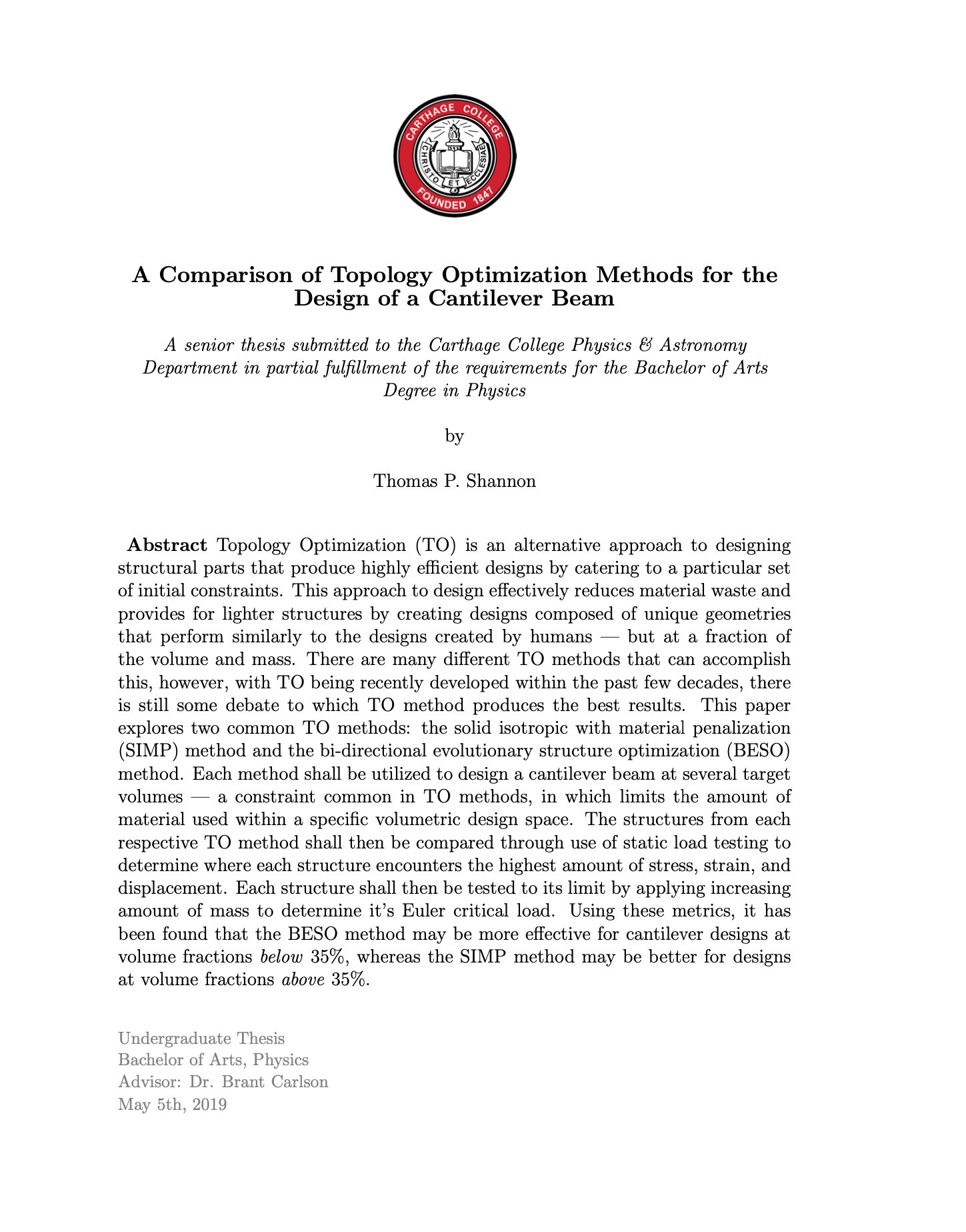 For my undergraduate thesis, I created software to conduct 3D structural topology optimization problems using the bi-directional evolutionary structure optimization (BESO) method. This code was written based on work done for the 2D case by Xie and Huang in the book, Evolutionary Topology Optimization of Continuum Structures: Methods and Applications. This work included building a finite element analysis suite for hexahedral elements and optimization methods. Future work is planned to be done to improve performace using cloud computing GPUs and to explore the usage of generative models to create similar structures in exceedly less time.
